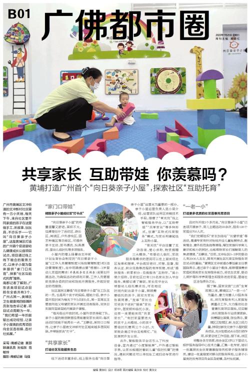 广州市黄埔区文冲街道的文冲新村社区里有一方小天地,每天下午,来自社区里不同家庭的孩子在这里做手工、听故事、玩玩具,不亦乐乎——它叫“向日葵亲子小屋”。这是黄埔区打造的广州首个促进婴幼儿健康成长公益