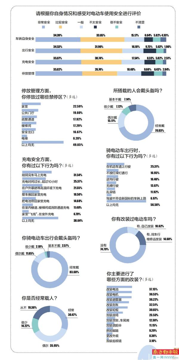 南都民调中心近日发布了《公众电动自行车使用习惯及安全意识调查报告(2022)》,此为报告下篇。本篇重点调查电动车使用群体的安全意识及车辆登记上牌情况等。报告显示:公众电动车使用安全意识有待提高,停放安全和充电安全隐患相对较大,半数受访车主曾违规停放过电动车,主要是放在家里;六成受访车主有过不规范充电行为,主要是刚骑完车就立即充电及充电时间过长;骑车出行载人现象普遍,机动车道占道行驶问题严重;两成半受访车主私改配件,主要是电池、电机和避震器。目前超八成受访车主已登记上牌,无牌上路行驶开罚支持率达近九成,但为进一步降低电动车安全风险,近八成受访车主表示会守交规、注意出行安全,七成受访者希望监管部门强化安全教育,提高公众安全意识。