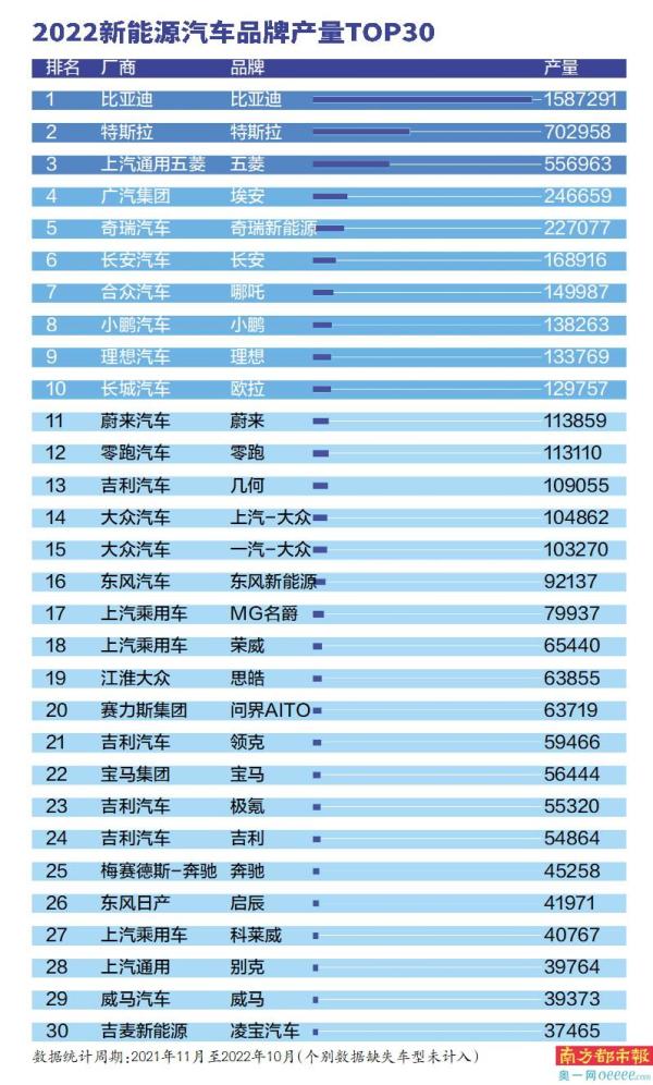 数据显示,2022年国内新能源车累计产量达到了625.3万辆。而在几个月前的2022世界动力电池大会上,有关报告才做出过大胆预测:2022年中国新能源汽车产量规模合计将达到562.7万辆。2022年1-10月,新能源汽车产量为548.5万辆,同比增长1.1倍。而在2021年最后两个月里面,国内新能源汽车产量分别达到了45.7万辆、51.8万辆。也就是说,这一年间合计产量就达到了646万辆。而在《2022新能源汽车百强报告》里,比亚迪、上汽通用五菱与特斯拉这头部三强,就合计贡献了44%的产量。