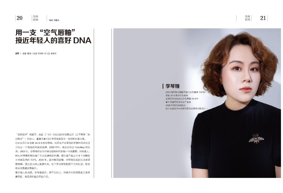李琴娅 2021 福布斯中国商界潜力女性榜单TOP10 拥有20 年美妆行业经验 全球知名化妆品公司任高管10余年 善于深度把控美妆全产业链 2018 年创立美尚股份