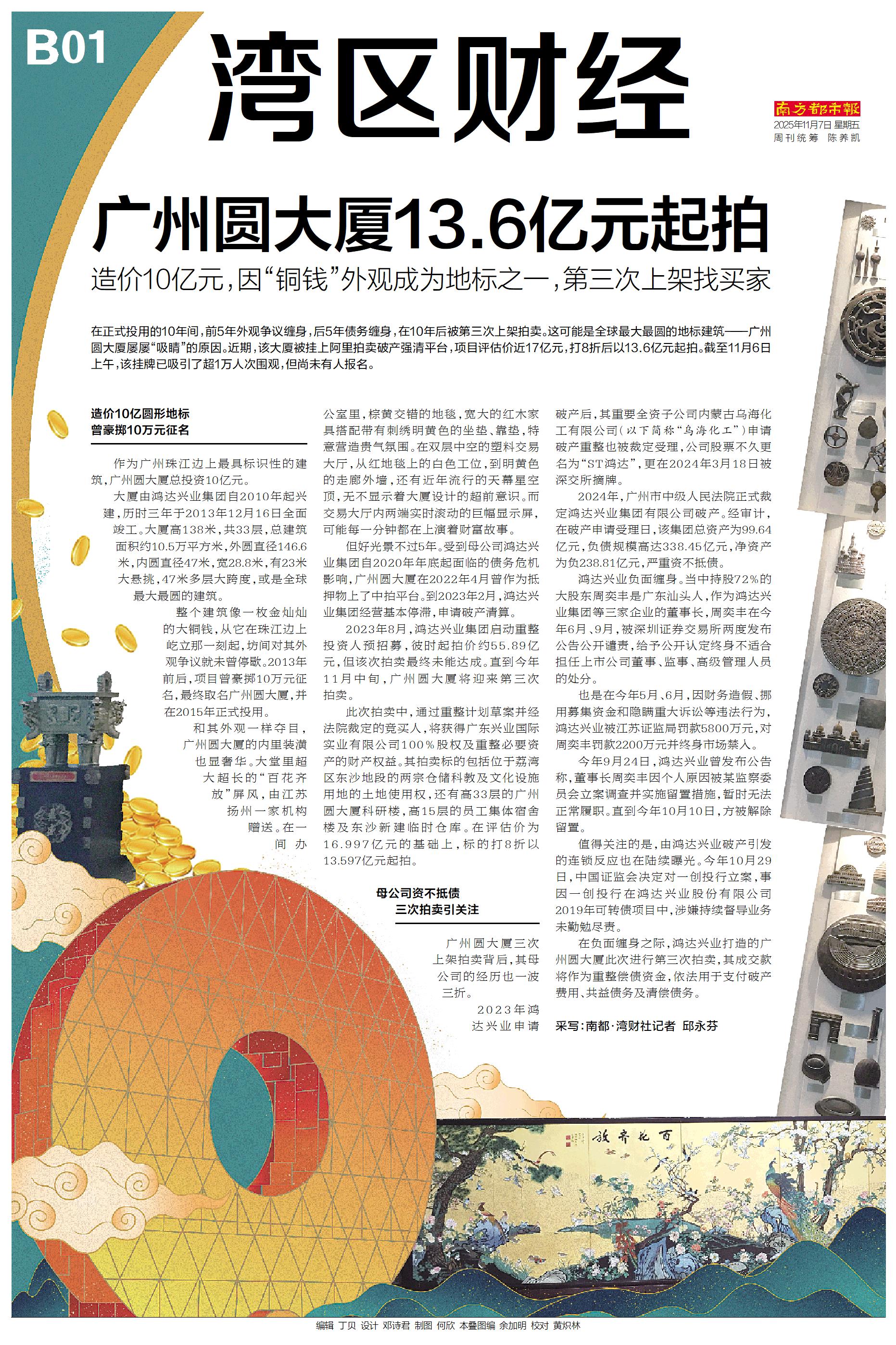 在正式投用的10年间,前5年外观争议缠身,后5年债务缠身,在10年后被第三次上架拍卖。这可能是全球最大最圆的地标建筑——广州圆大厦屡屡“吸睛”的原因。近期,该大厦被挂上阿里拍卖破产强清平台,项目评