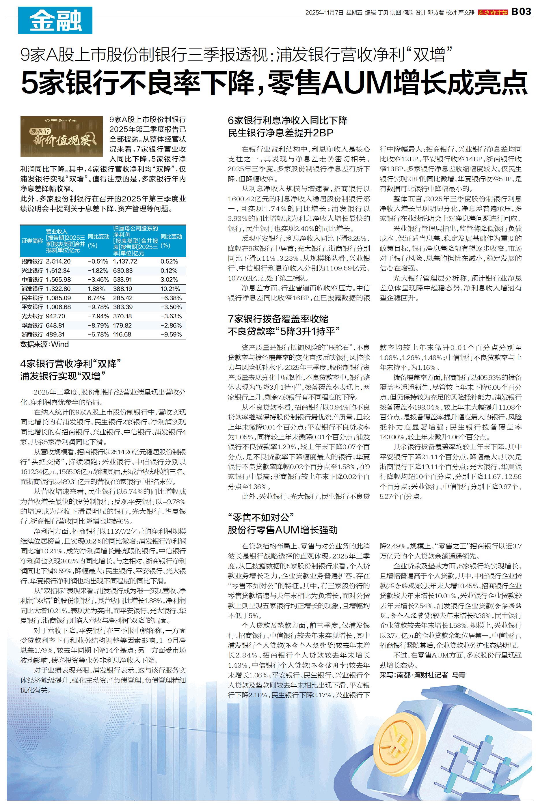 9家A股上市股份制银行2025年第三季度报告已全部披露。从整体经营状况来看,7家银行营业收入同比下降,5家银行净利润同比下降。其中,4家银行营收净利均“双降”,仅浦发银行实现“双增”。值得注意的是