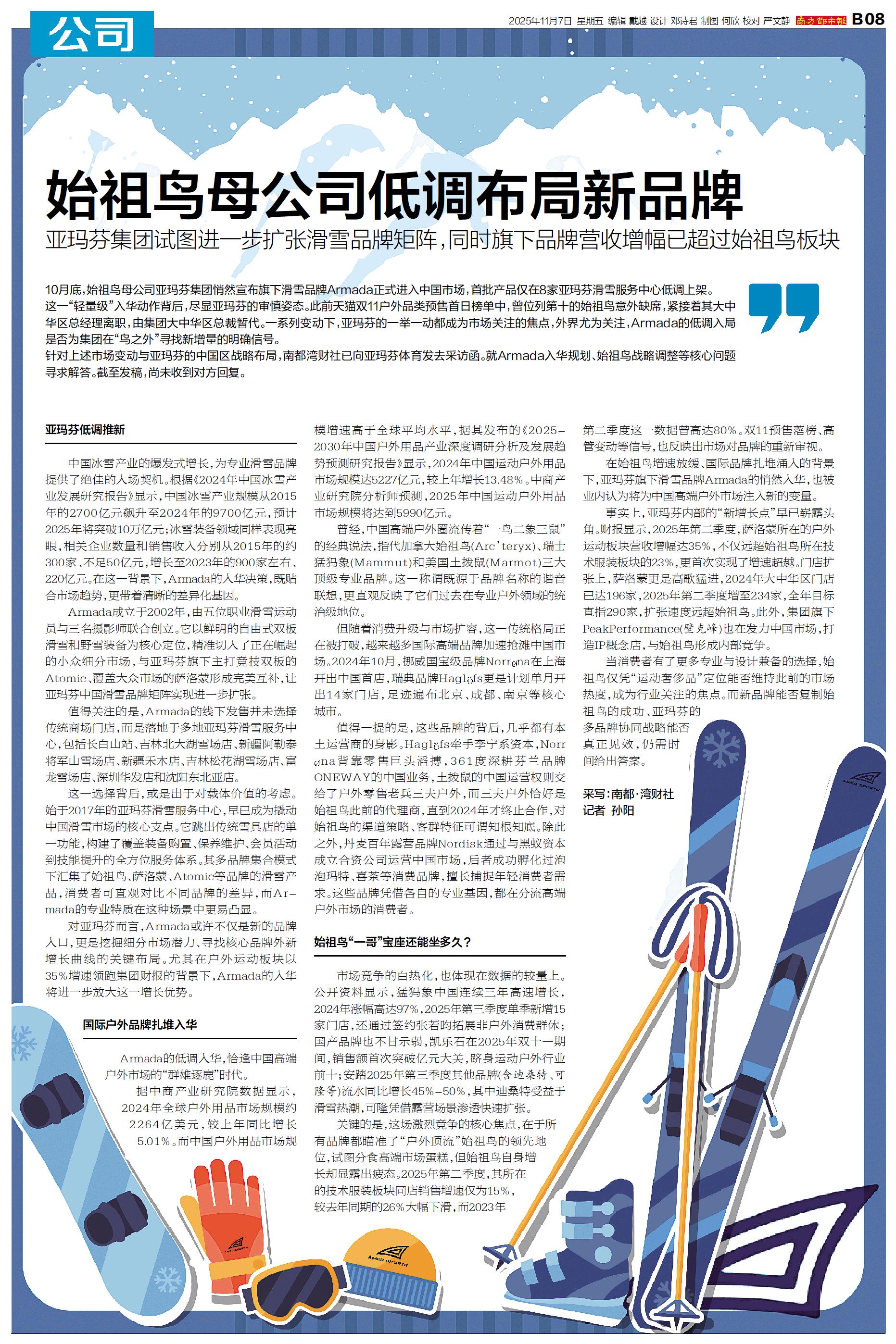 10月底,始祖鸟母公司亚玛芬集团悄然宣布旗下滑雪品牌Armada正式进入中国市场,首批产品仅在8家亚玛芬滑雪服务中心低调上架。 这一“轻量级”入华动作背后,尽显亚玛芬的审慎姿态。此前天猫双11户