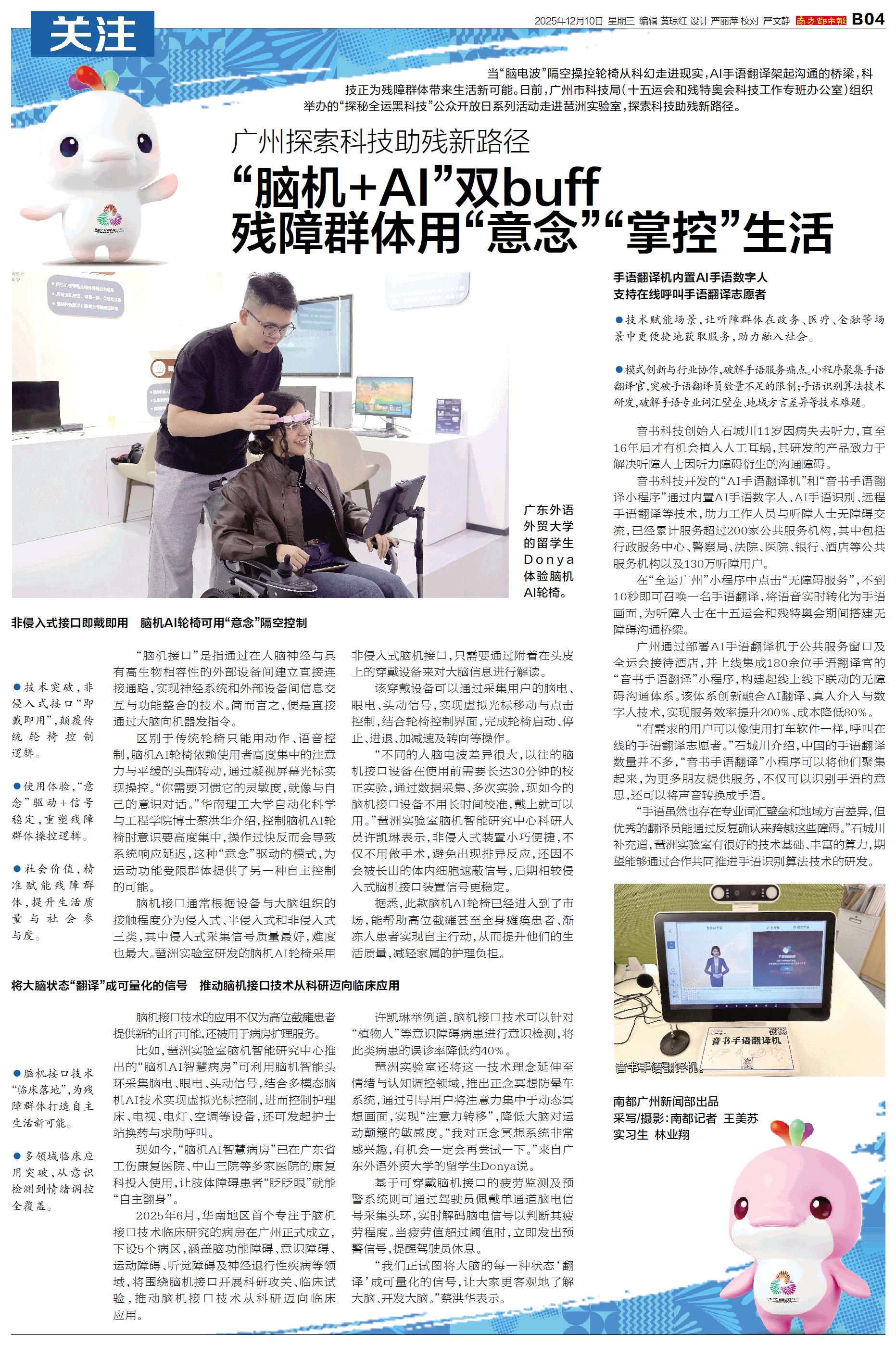 当“脑电波”隔空操控轮椅从科幻走进现实,AI手语翻译架起沟通的桥梁,科技正为残障群体带来生活新可能。日前,广州市科技局(十五运会和残特奥会科技工作专班办公室)组织举办的“探秘全运黑科技”公众开放日系列活动走进琶洲实验室,探索科技助残新路径。