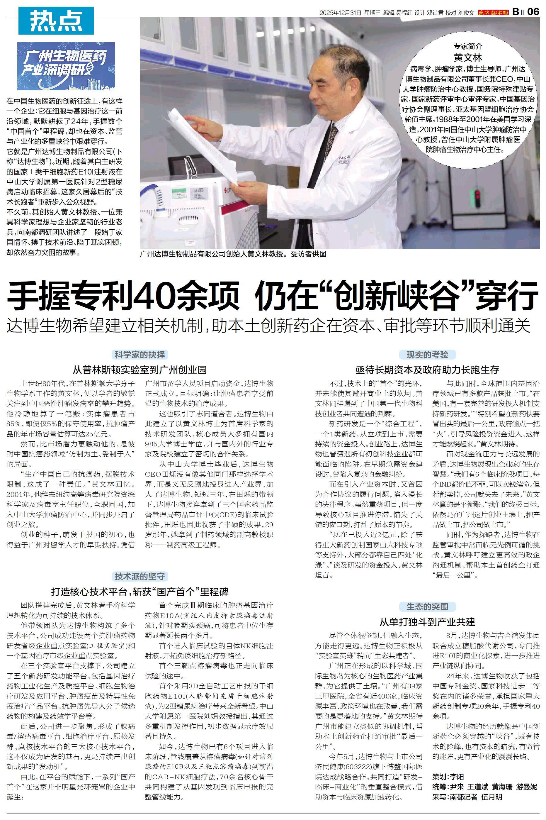 专家简介 黄文林 病毒学、肿瘤学家,博士生导师,广州达博生物制品有限公司董事长兼CEO,中山大学肿瘤防治中心教授,国务院特殊津贴专家,国家新药评审中心审评专家,中国基因治疗协会副理事长、亚太基