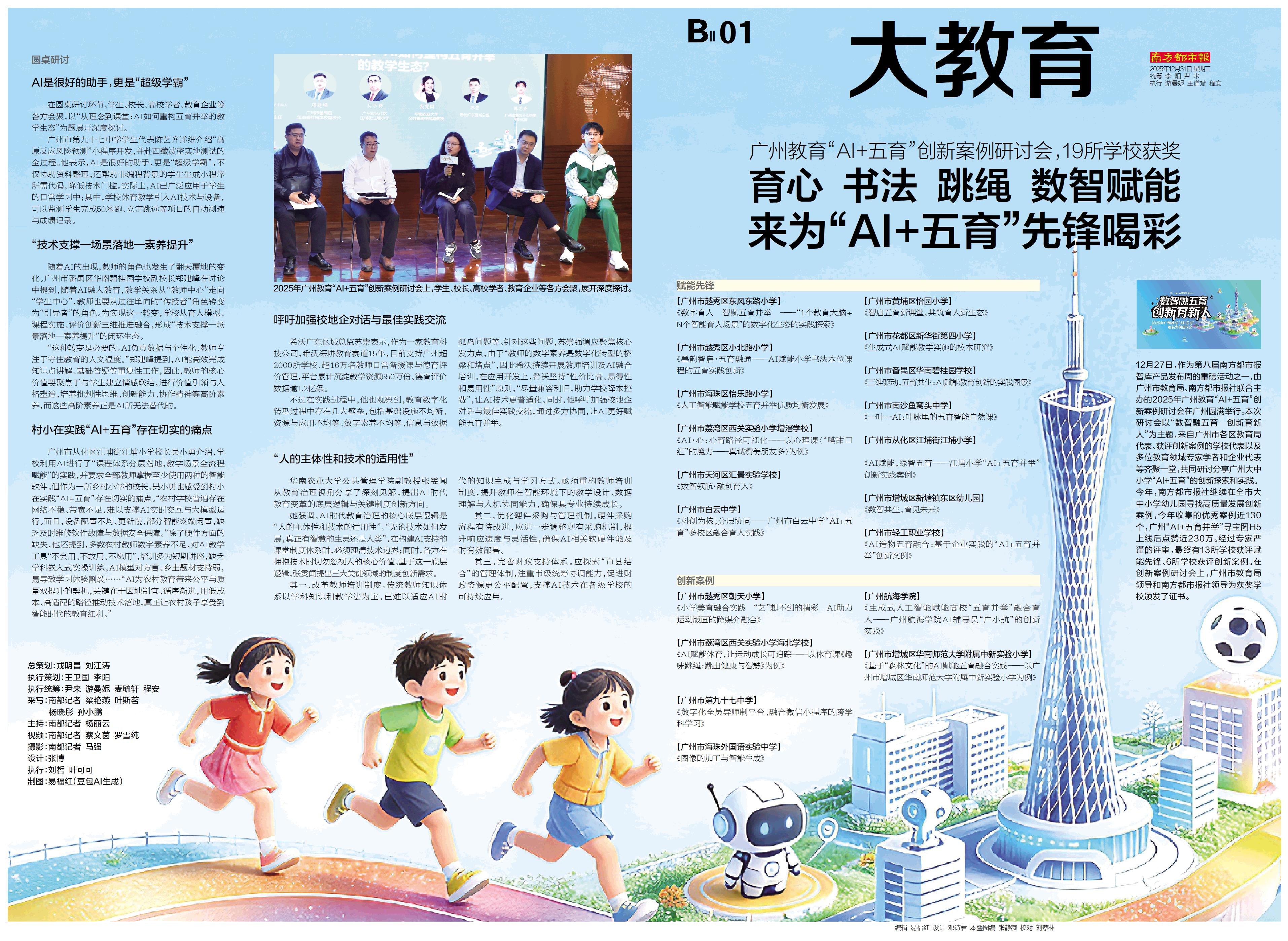 12月27日,作为第八届南方都市报智库产品发布周的重磅活动之一,由广州市教育局、南方都市报社联合主办的2025年广州教育“AI+五育”创新案例研讨会在广州圆满举行。本次研讨会以“数智融五育 创新育