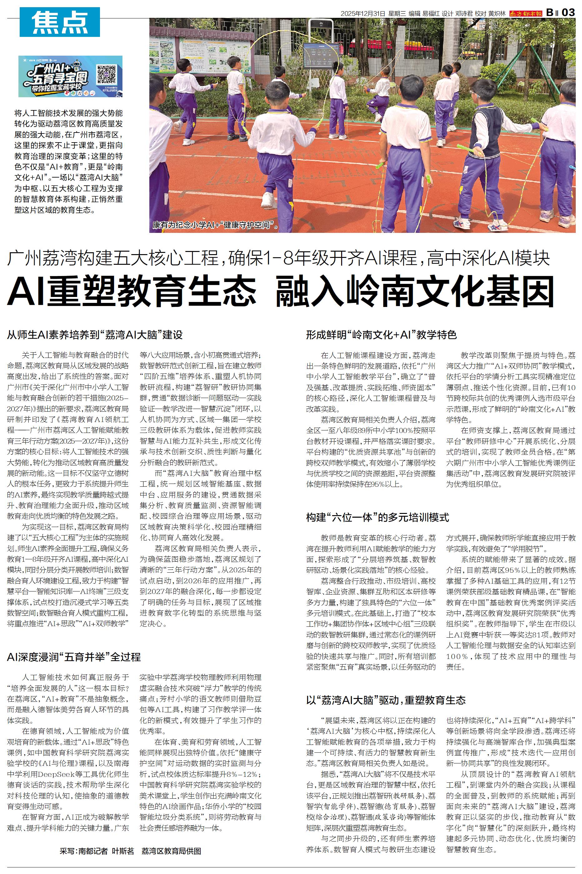 将人工智能技术发展的强大势能转化为驱动荔湾区教育高质量发展的强大动能,在广州市荔湾区,这里的探索不止于课堂,更指向教育治理的深度变革;这里的特色不仅是“AI+教育”,更是“岭南文化+AI”。一场以