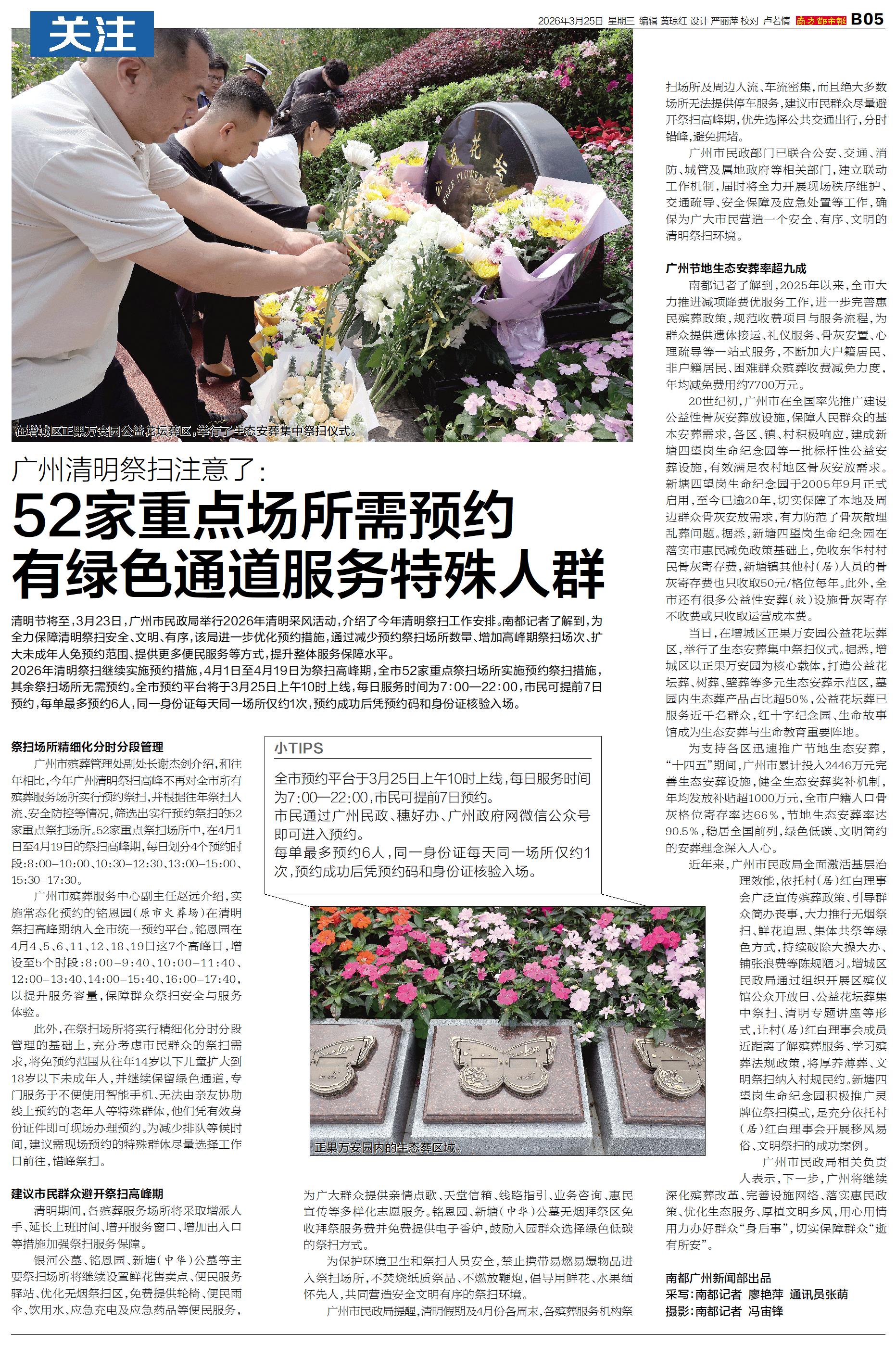 清明节将至,3月23日,广州市民政局举行2026年清明采风活动,介绍了今年清明祭扫工作安排。南都记者了解到,为全力保障清明祭扫安全、文明、有序,该局进一步优化预约措施,通过减少预约祭扫场所数量、增