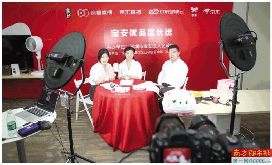 宝安区区长郭子平(中)、宝安区副区长娄岩峰(右)为宝安优品直播“带货”。