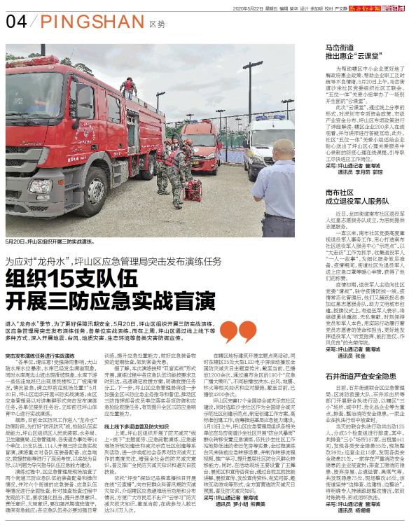 进入“龙舟水”季节,为了更好保障汛期安全,5月20日,坪山区组织开展三防实战演练,区应急管理局突击发布演练任务,各单位实战演练。而在上周,坪山区通过线上线下等多种方式,深入开展地震、台风、地质灾害、生
