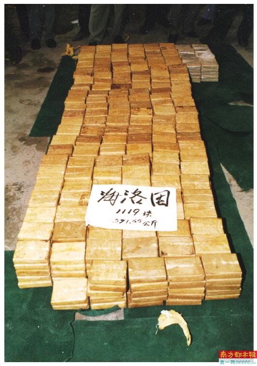 在深圳市公安局指挥部档案科,有这样一张照片:棕黄色、书册形的块状物,每五个一摞码放在铺着绿色绒垫的地面上,如此组成的六列、二十多行的矩阵几乎占满了整个画面,一纸说明简要但精准地描述了这个矩阵的信息:“海洛因”、“1119块”、“591.65公斤”。