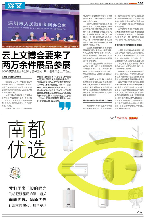 南都讯 记者谢湘南 11月10日,第十六届中国(深圳)国际文化产业博览交易会(云上文博会)新闻发布会,在深圳市政府新闻发布厅举行。本届文博会将于11月16—20日在线上举办,并24小时开放。此次云上文