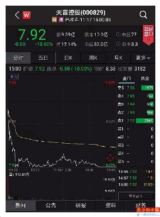 令人意外的是,在A股市场上,多家荣耀供应链企业的股价出现大跌。其中,天音通信有限公司为天音控股子公司,16日天音控股尾盘涨停,17日高开一字板后随即下跌,最终以跌停收盘。