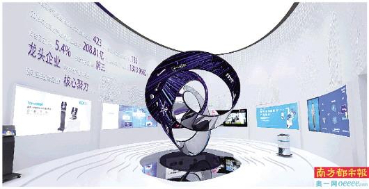 “心聚·产业核心”展区以城市会客厅为轮廓,点击进入参观按钮,“城市美学,印象宝安”的主题映入眼帘,下面是“宝安欢迎您”字样,往左边是三个莫比乌斯环的艺术装置,41家企业的logo显示在液晶屏幕上,体现文化、科技、创意的融合和交互。城市会客厅的墙体用浮雕形式展现深圳国际会展中心、宝安图书馆、北帝古庙等城市地标,墙上的文化橱窗介绍和推介了龙头企业,尽显宝安文化产业的实力与内涵,依靠强大的产业基础,宝安“文化+科技”的文化产业特色日益鲜明。该展区以文化龙头企业为核心,涵盖文化装备、高端印刷、数字内容等行业。