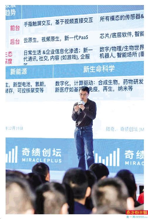 南都讯 记者张馨怡 12月19日下午,奇绩创坛深圳交流会在深圳市福田区新一代产业园国际会议中心举行。奇绩创坛创始人兼CEO陆奇博士向到场的科技企业负责人、创业团队、高校院所科研人员、投资人等分享了技术创业创新的趋势和当下创业的机会,陆奇认为疫情将加速4大核心长期趋势,加速推动新格局形成。同时,他盛赞深圳的政策扶持,望与当地开展深度合作。