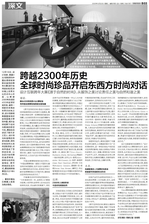 12月18日,设计互联、英国V&A博物馆与中国丝绸博物馆联合呈现的跨年大展《源于自然的时尚》在深圳海上世界文化艺术中心开幕,以跨越2300年历史的400件全球时尚珍品,呈现一场前所未有的东西方时尚之旅