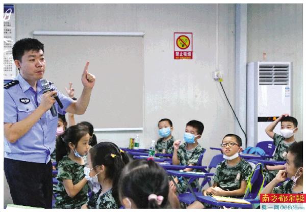 深圳市公安局宝安分局反诈中心民警姚晖给少年义警做反诈培训。