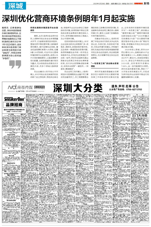南都讯 记者傅静怡 日前,深圳市政府新闻办举行新闻发布会,宣布《深圳经济特区优化营商环境条例》(以下简称《条例》)将于2021年1月1日正式施行。这意味着深圳政府部门将迎来更为规范的行政“紧箍咒”,市