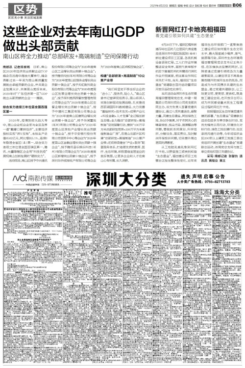 南都讯 记者陈紫嫣 日前,南山区2020年经济突出贡献企业TOP峰会在后海中海油大厦举行。峰会表彰过去一年来为南山高质量发展做出卓越贡献的企业,并共商企业发展大计、共谋南山美好未来。2020年对“广东
