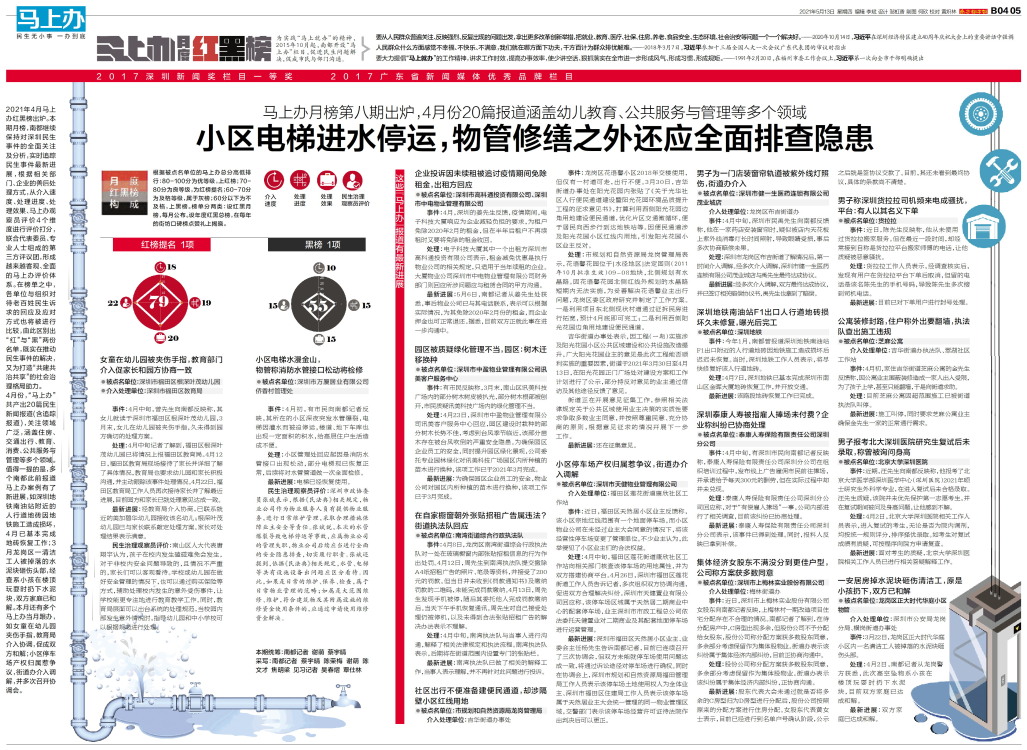 2021年4月马上办红黑榜出炉。本期月榜,南都继续保持对深圳民生事件的全面关注及分析,实时追踪民生事件最新进展,根据相关部门、企业的善后处理方式,从介入速度、处理进度、处理效果、马上办观察员评价4个维