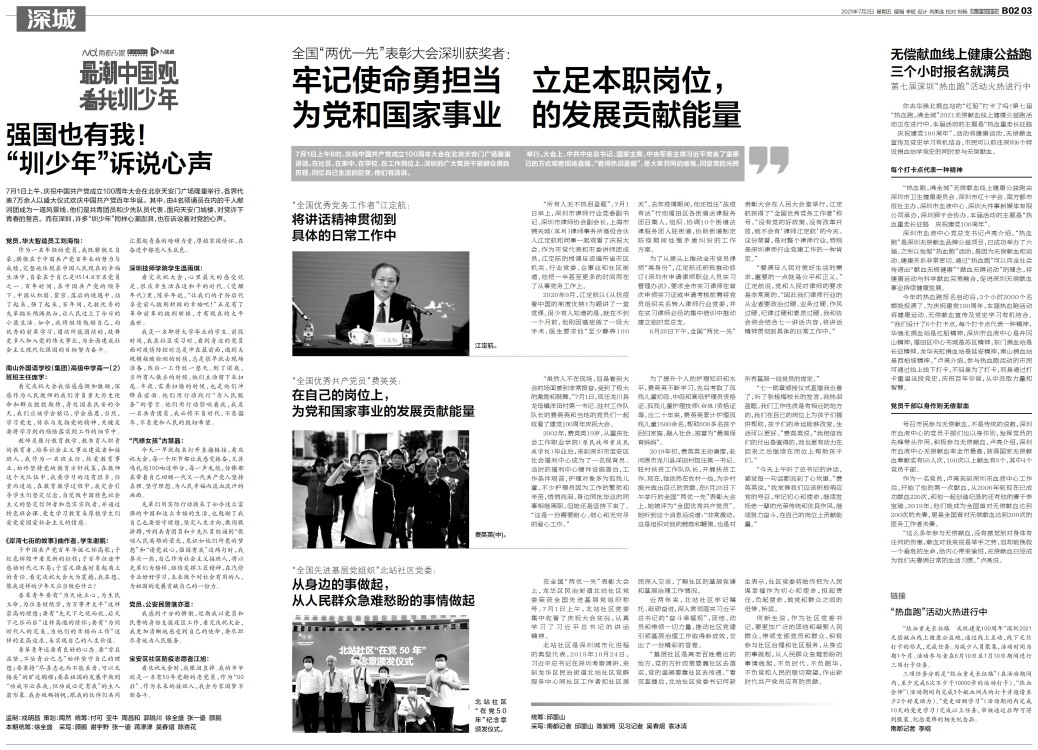 7月1日上午8时,庆祝中国共产党成立100周年大会在北京天安门广场隆重 举行。大会上,中共中央总书记、国家主席、中央军委主席习近平发表了重要讲话。在社区、在家中、在学校、在工作岗位上,深圳的广