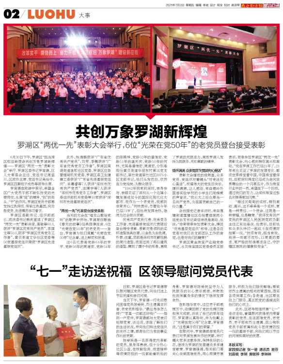 6月30日下午,罗湖区“担当湾区枢纽新使命共创万象罗湖新辉煌——罗湖区‘两优一先’表彰大会”举行。罗湖区委书记罗育德,区人大常委会主任、党组书记周益川,区政协主席、党组书记吴裕中,罗湖区四套班子成