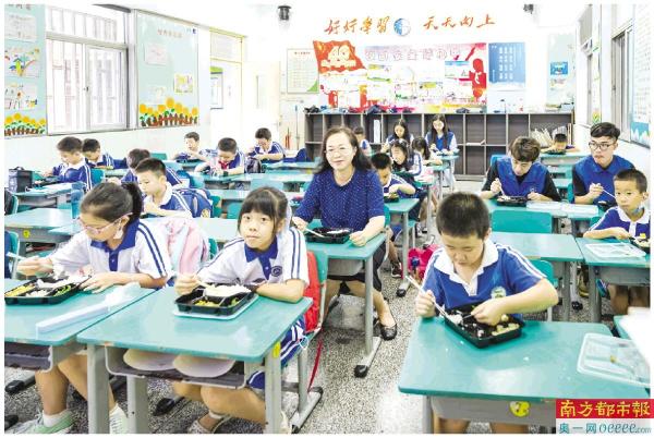 莲南小学暑期托管服务首日,老师与学生们共进午餐。 南都记者 谢粤蕾 通讯员 朱缨 摄