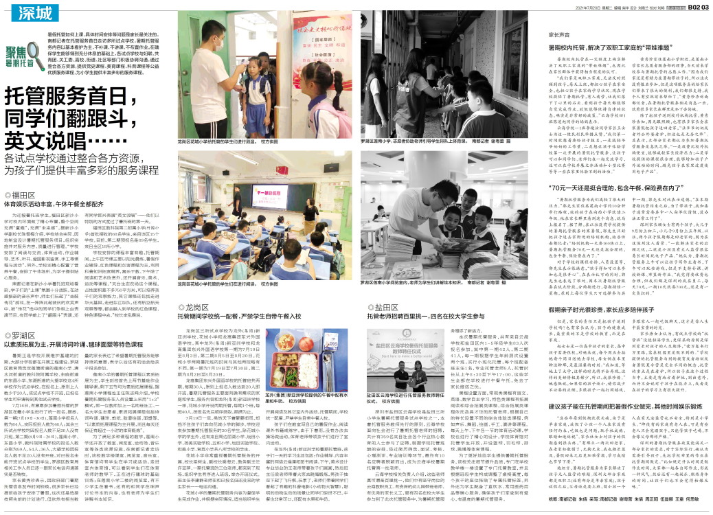 暑假托管如何上课、具体时间安排等问题是家长最关注的,南都记者在托管服务首日走访多所试点学校,暑期托管服务内容以基本看护为主,不补课、不讲课、不布置作业。在确保学生能够得到充分休息的基础上,各试点学