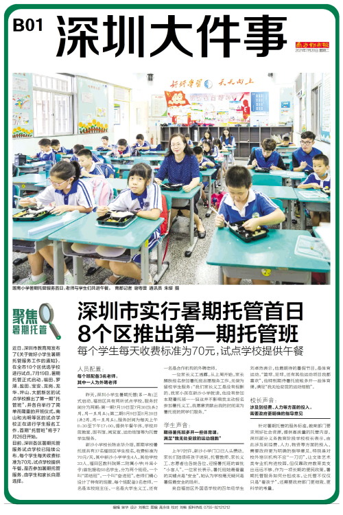 近日,深圳市教育局发布了《关于做好小学生暑期托管服务工作的通知》,在全市10个区优选学校进行试点。7月19日,暑期托管正式启动,福田、罗湖、盐田、宝安、龙岗、龙华、坪山、大鹏新区的试点学校推出了第