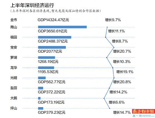 纵观各区“半年报”可以发现,南山一如既往稳坐头把交椅,GDP突破3000亿元经济持续领跑;宝安自光明、龙华划分出去之后,GDP首次突破2000亿元大关;科学城建设方兴未艾的光明,GDP增速排名全市第一,正在进行城区新一轮改造的罗湖,固定资产投资全市第一。