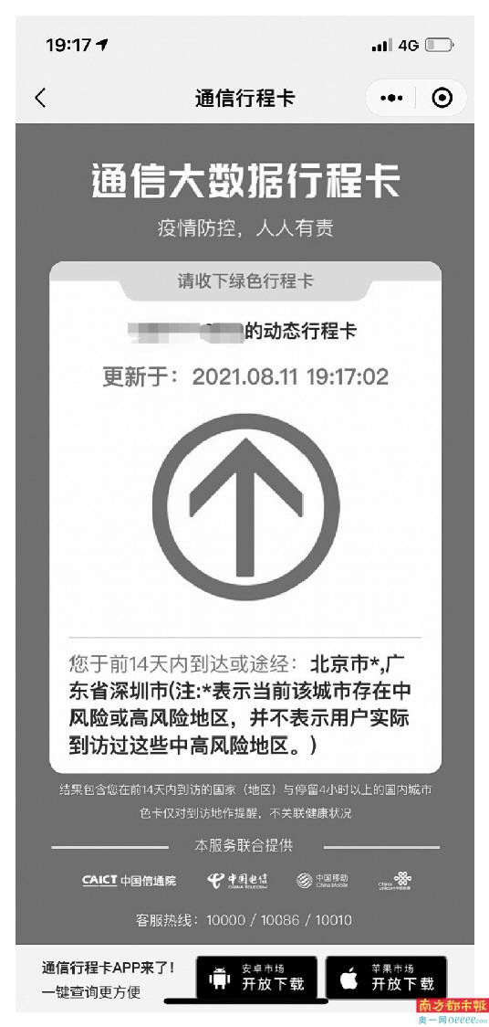 据了解,陈女士7月28日从北京返回深圳,至参加科目二考试当天,行程卡仍显示“北京市*”的行程轨迹。另外,行程卡中亦显示有(注:*表示当前该城市存在中风险或高风险地区,并不代表用户实际到访过这些中高风险地区)。