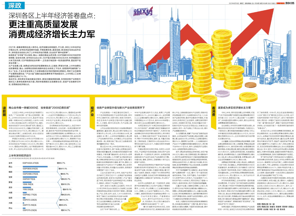 2021年,随着疫情防控进入常态化,经济发展也持续复苏。不久前,深圳上半年经济运行情况公布,全市经济呈现稳中加固、平稳发展态势。截至目前,除龙岗区与深汕合作区外,深圳各区也纷纷公布了上半年经济运行