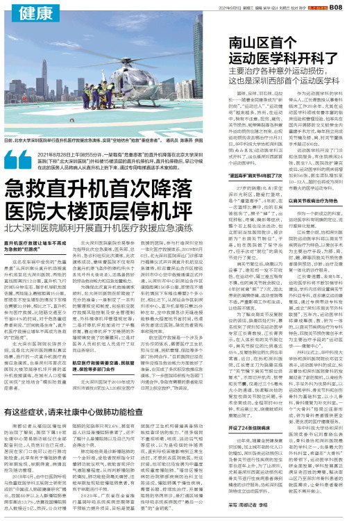 2021年8月28日上午9时55分许,一架载有“危重患者”的直升机降落在北京大学深圳医院(下称“北大深圳医院”)外科楼15楼顶层的直升机停机坪。直升机停稳后,早已守候在此的医务人员将病人从直升机上