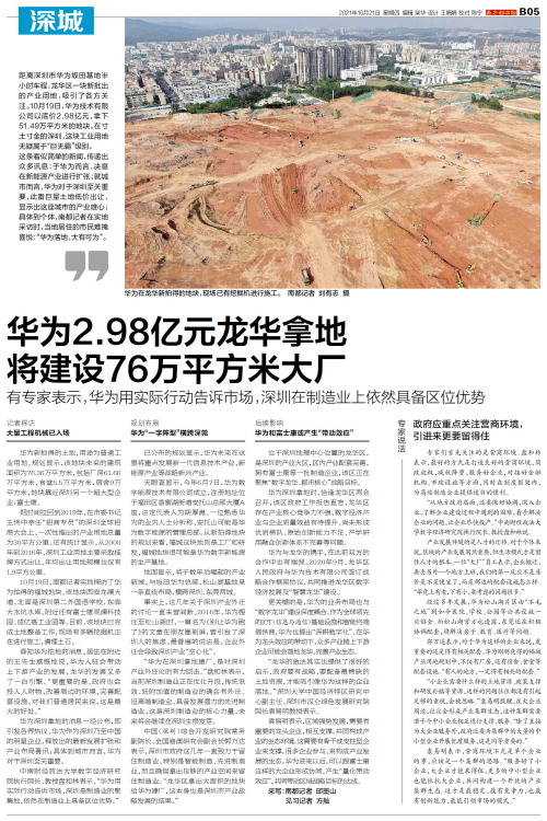 华为2.98亿元龙华拿地 将建设76万平方米大厂