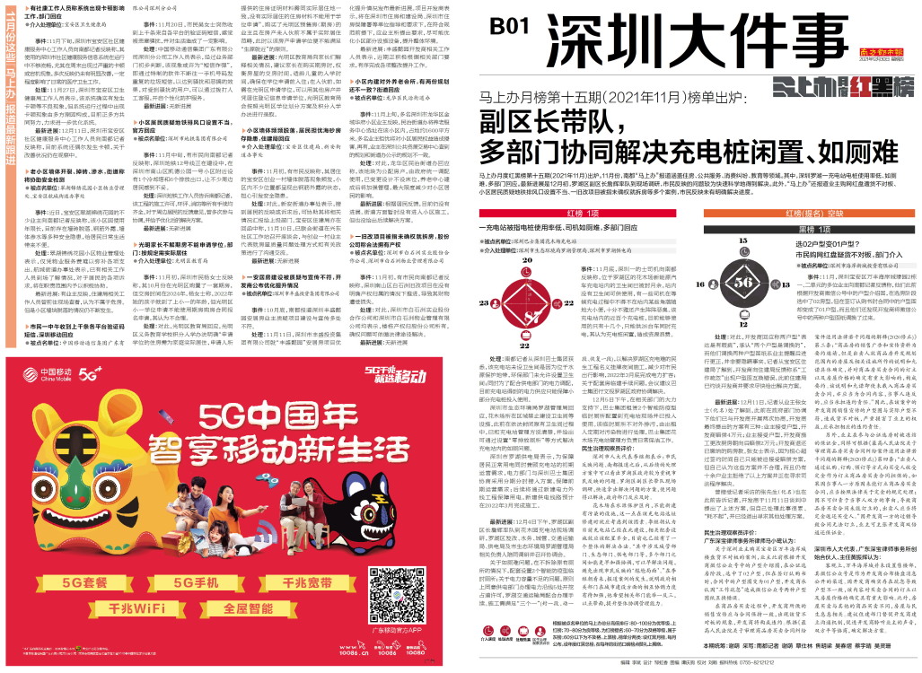 马上办月度红黑榜第十五期(2021年11月)出炉。11月份,南都“马上办”报道涵盖住房、公共服务、消费纠纷、教育等领域。其中,深圳罗湖一充电站电桩使用率低、如厕难,多部门回应。最新进展是12月初,