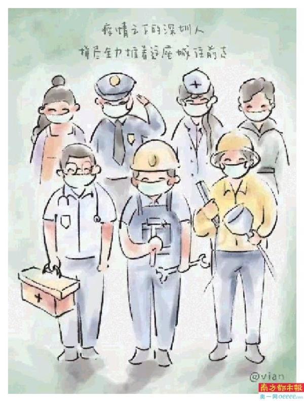 “这就是深圳人,他们构成了深圳的底色。”杨寅用多幅原创漫画陈述了深圳的抗“疫”故事,用一笔一画展现了疫情中的暖心故事,致敬抗疫中的医护人士、志愿者和所有工作人员。