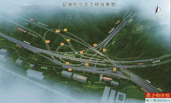 盐港东立交工程位于盐田区东港区北面,与盐坝高速、坪盐通道、拟建盐龙快速、东港区进港路交叉,为5路交叉的大型枢纽立交。该项目新建匝道10条,总长约7.71公里(包括新建桥梁16座,桥梁总长4.12公里;隧道5条,总长1974米,桥隧比81%),是深圳市首个装配式桥梁试点工程,同时也是深圳市最为复杂的立交之一。