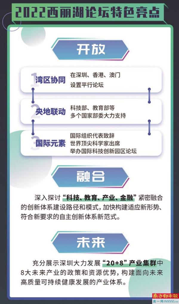 本届论坛更加突出“开放”理念,着力展现湾区协同、央地联动和国际元素;更加突出“融合”特点,深入探讨“科技、教育、产业、金融”紧密融合的创新体系建设路径和模式,加快构建适应新形势、符合新要求的自主创新体系新范式;更加突出“未来”导向,充分展示深圳“20+8”产业集群中“8”大未来产业的政策和资源优势,构建面向未来高质量可持续健康发展的产业体系。