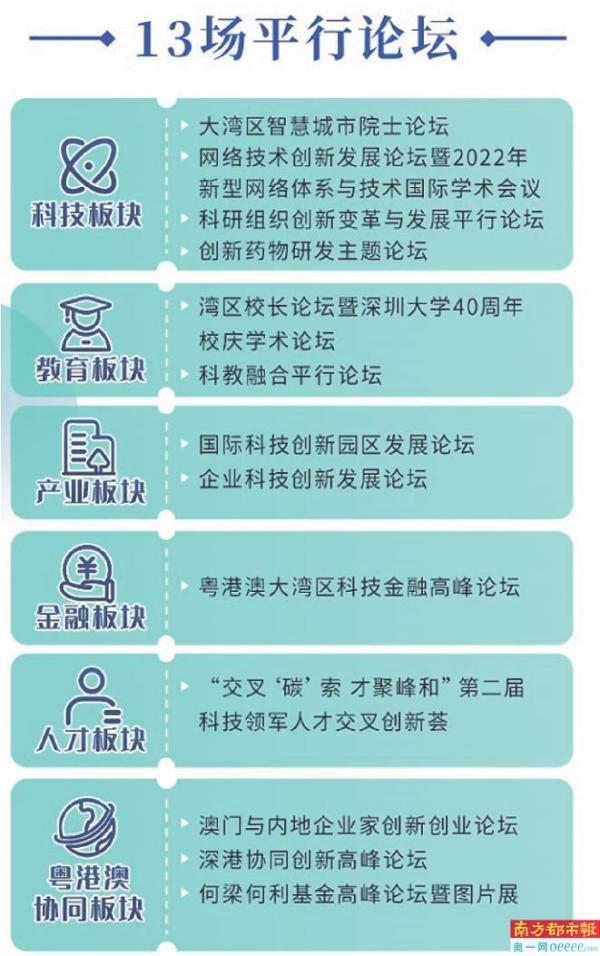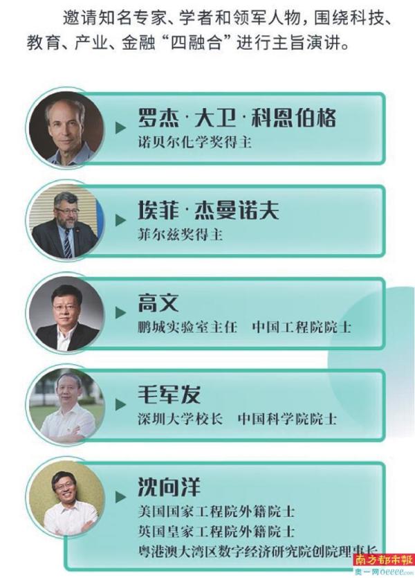 据了解,主论坛将邀请香港特别行政区行政长官李家超、澳门特别行政区行政长官贺一诚、联合国工业发展组织执行干事邹刺勇视频致辞,粤港澳大湾区多所知名高校校长向论坛发表贺词。国内外知名专家学者和领军人物将围绕科技、教育、产业、金融“四融合”领域进行主旨演讲。邀请诺贝尔化学奖得主罗杰·大卫·科恩伯格,菲尔兹奖得主埃菲·杰曼诺夫,美国国家工程院外籍院士、英国皇家工程院外籍院士沈向洋,鹏城实验室主任、中国工程院院士高文,深圳大学校长、中国科学院院士毛军发等多个领域的领军人物代表汇聚一堂。