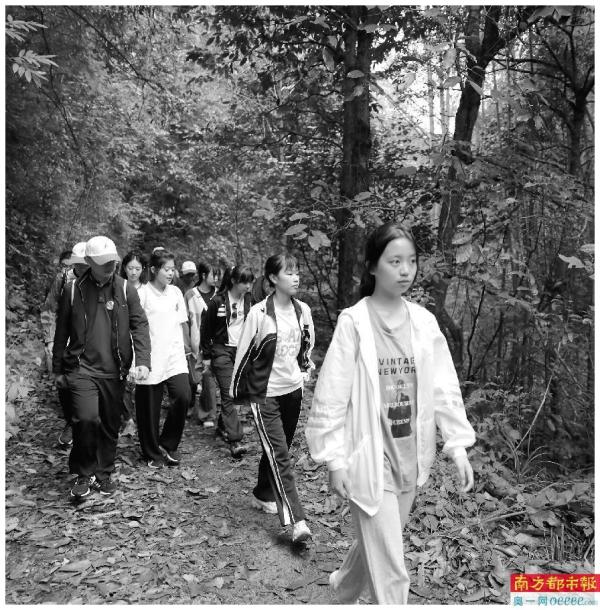 路边不时显露出的山涧潺潺流淌着,学生们踩过变得泥泞的小路,脚上的鞋被水浸湿、沾满了黄泥。爬陡坡时,学生们或拄着木棍、或手脚并用,衣袖、裤脚、膝盖处也都难免裹上层泥。