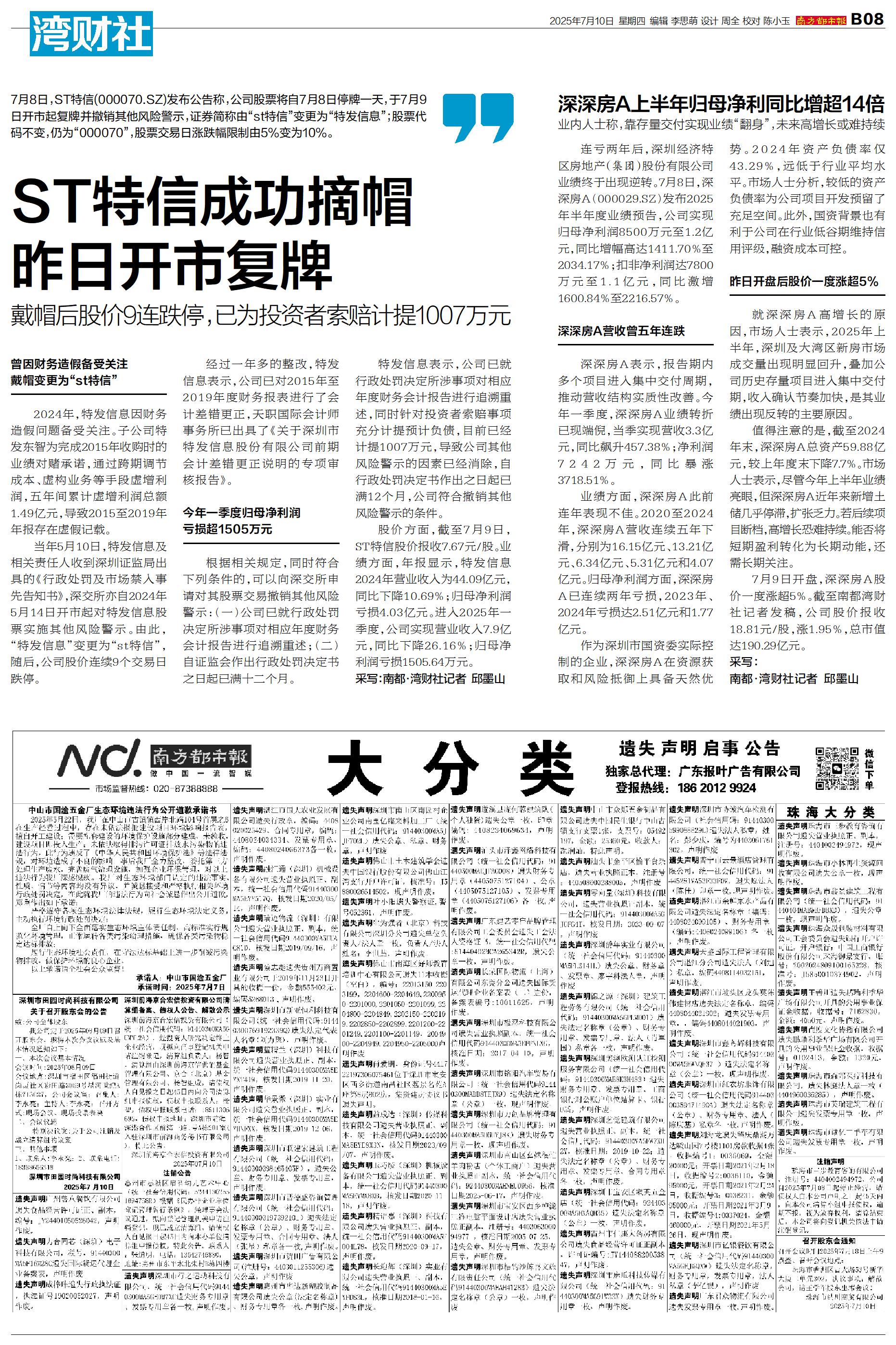连亏两年后,深圳经济特区房地产(集团)股份有限公司业绩终于出现逆转。7月8日,深深房A(000029.SZ)发布2025年半年度业绩预告,公司实现归母净利润8500万元至1.2亿元,同比增幅高达1