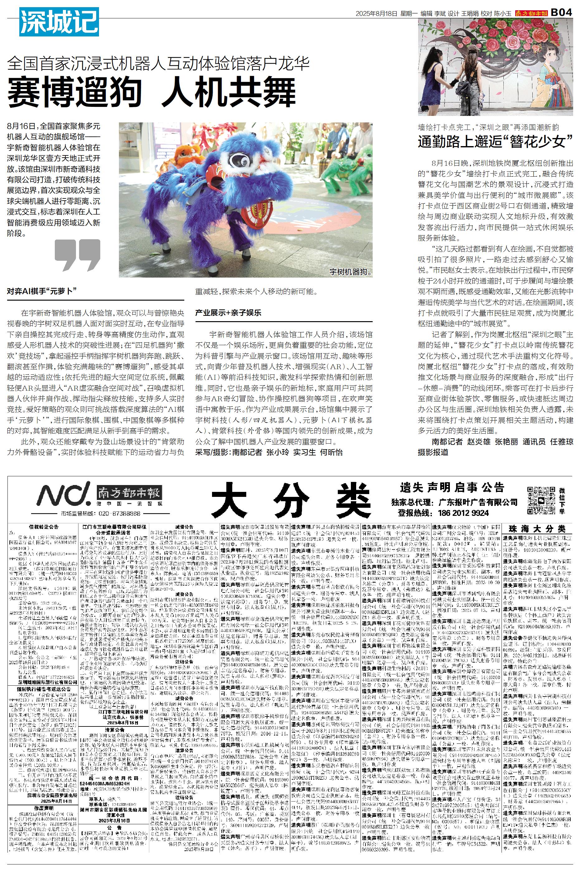 8月16日,全国首家聚焦多元机器人互动的旗舰场馆——宇新奇智能机器人体验馆在深圳龙华区壹方天地正式开放。该馆由深圳市新奇通科技有限公司打造,打破传统科技展览边界,首次实现观众与全球尖端机器人进行零
