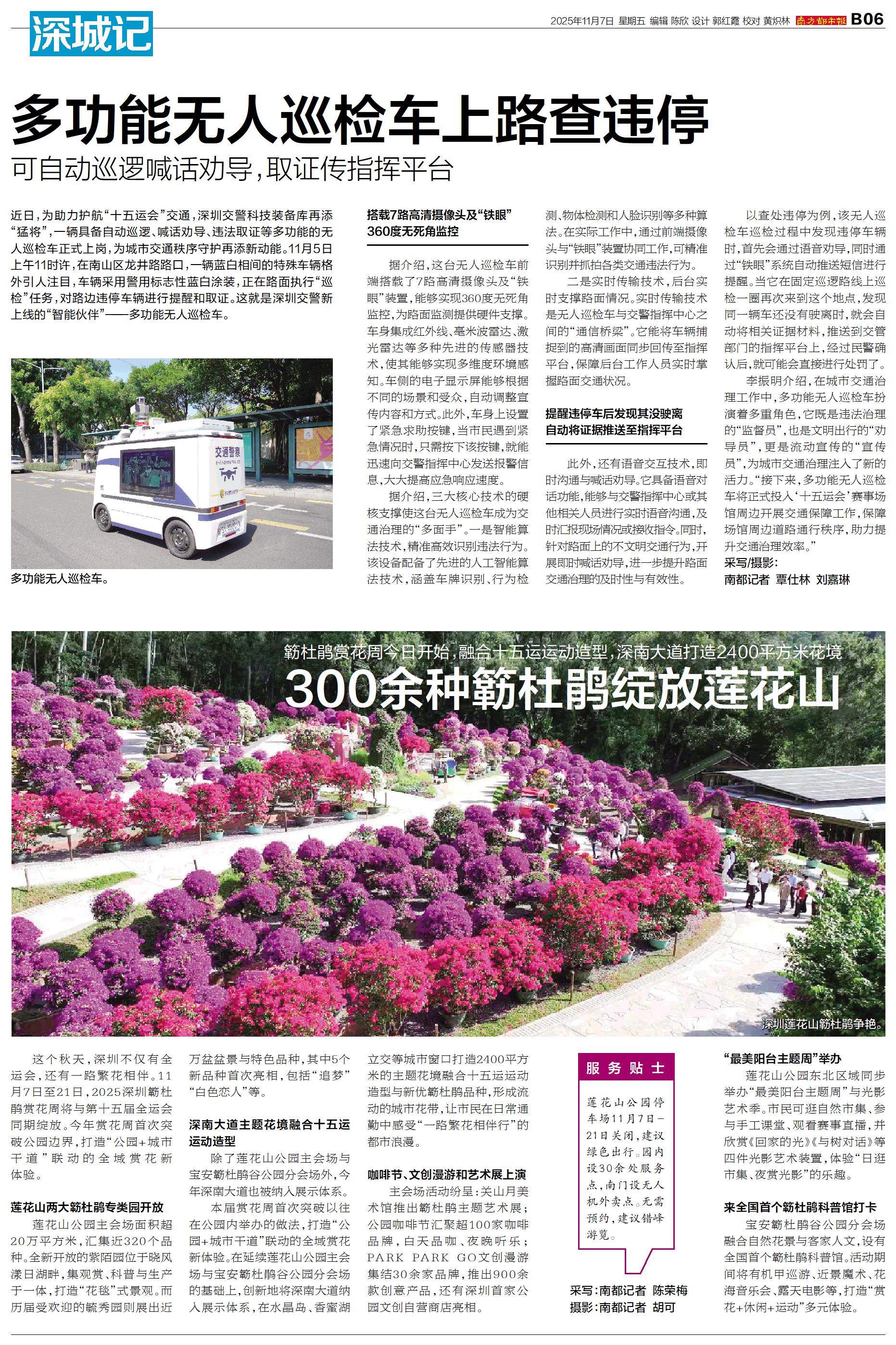 近日,为助力护航“十五运会”交通,深圳交警科技装备库再添“猛将”,一辆具备自动巡逻、喊话劝导、违法取证等多功能的无人巡检车正式上岗,为城市交通秩序守护再添新动能。11月5日上午11时许,在南山区龙