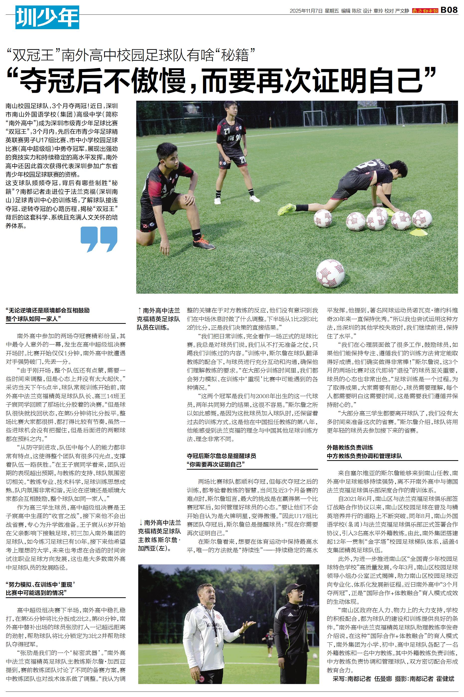 南山校园足球队,3个月夺两冠!近日,深圳市南山外国语学校(集团)高级中学(简称“南外高中”)成为深圳市级青少年足球比赛“双冠王”,3个月内,先后在市青少年足球精英联赛男子U17组比赛、市中小学校园