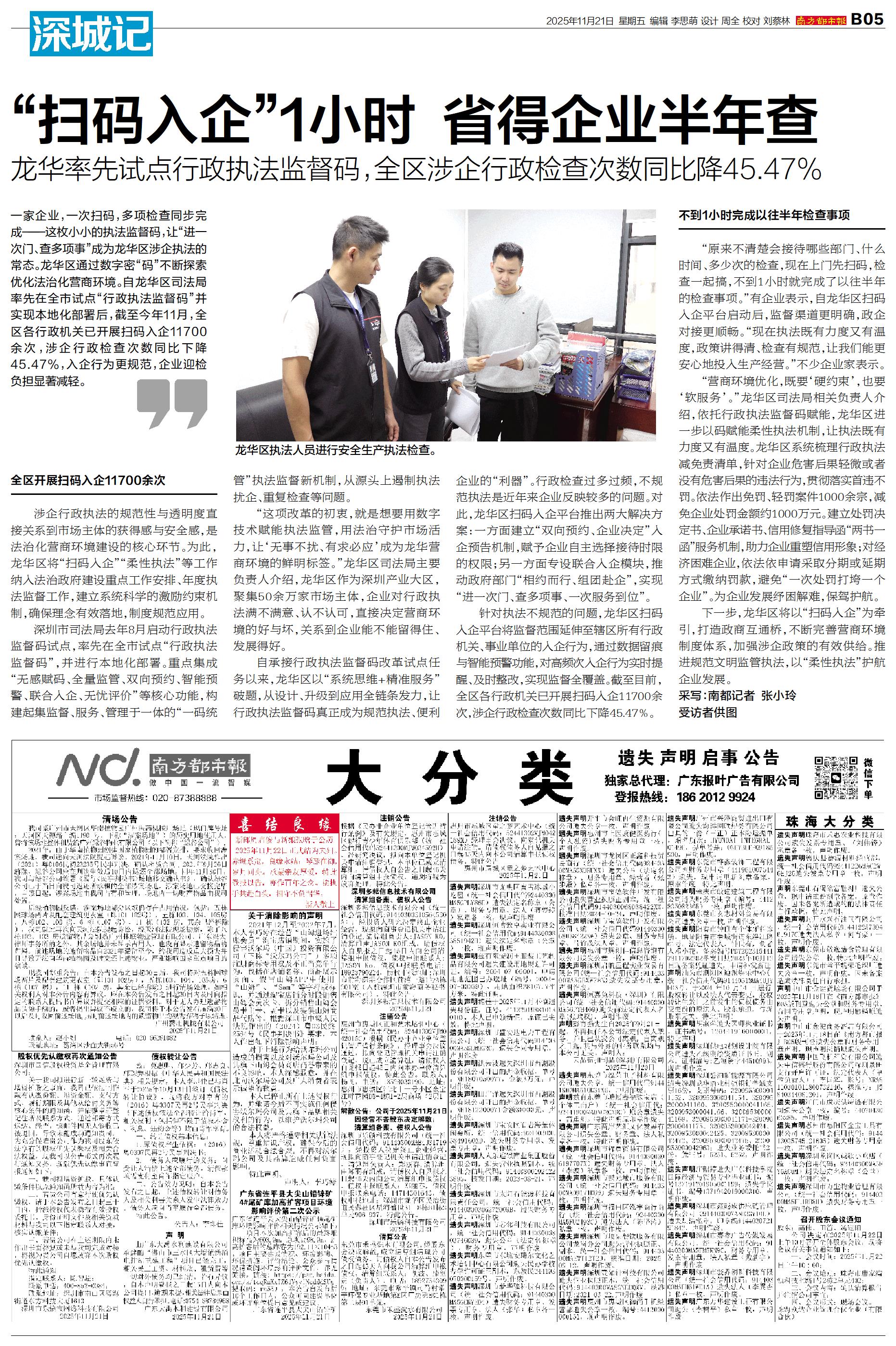 “原来不清楚会接待哪些部门、什么时间、多少次的检查,现在上门先扫码,检查一起搞,不到1小时就完成了以往半年的检查事项。”有企业表示,自龙华区扫码入企平台启动后,监督渠道更明确,政企对接更顺畅。“现在执法既有力度又有温度,政策讲得清、检查有规范,让我们能更安心地投入生产经营。”不少企业家表示。