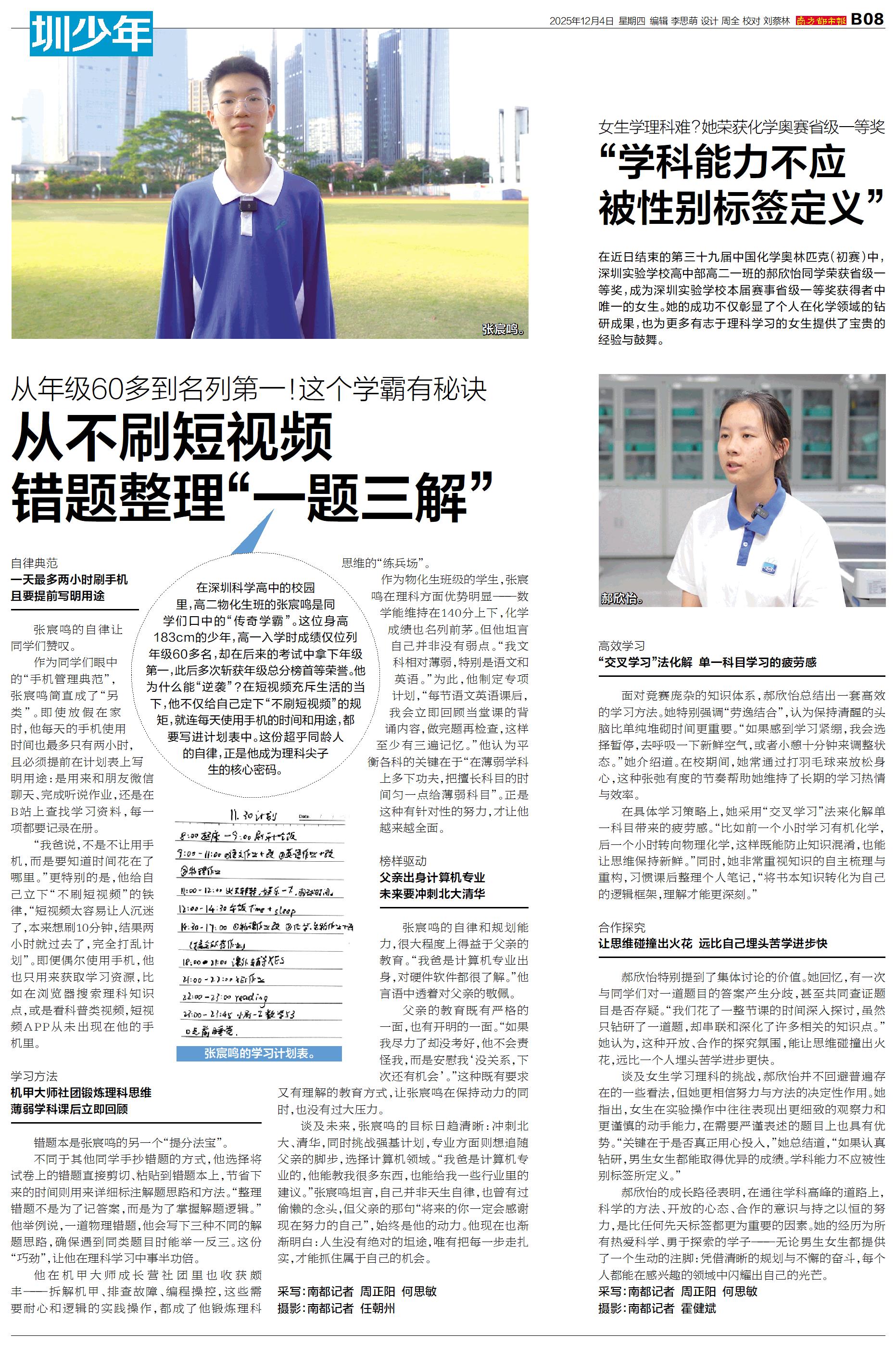 在深圳科学高中的校园里,高二物化生班的张宸鸣是同学们口中的“传奇学霸”。这位身高183cm的少年,高一入学时成绩仅位列年级60多名,却在后来的考试中拿下年级第一,此后多次斩获年级总分榜首等荣誉。他