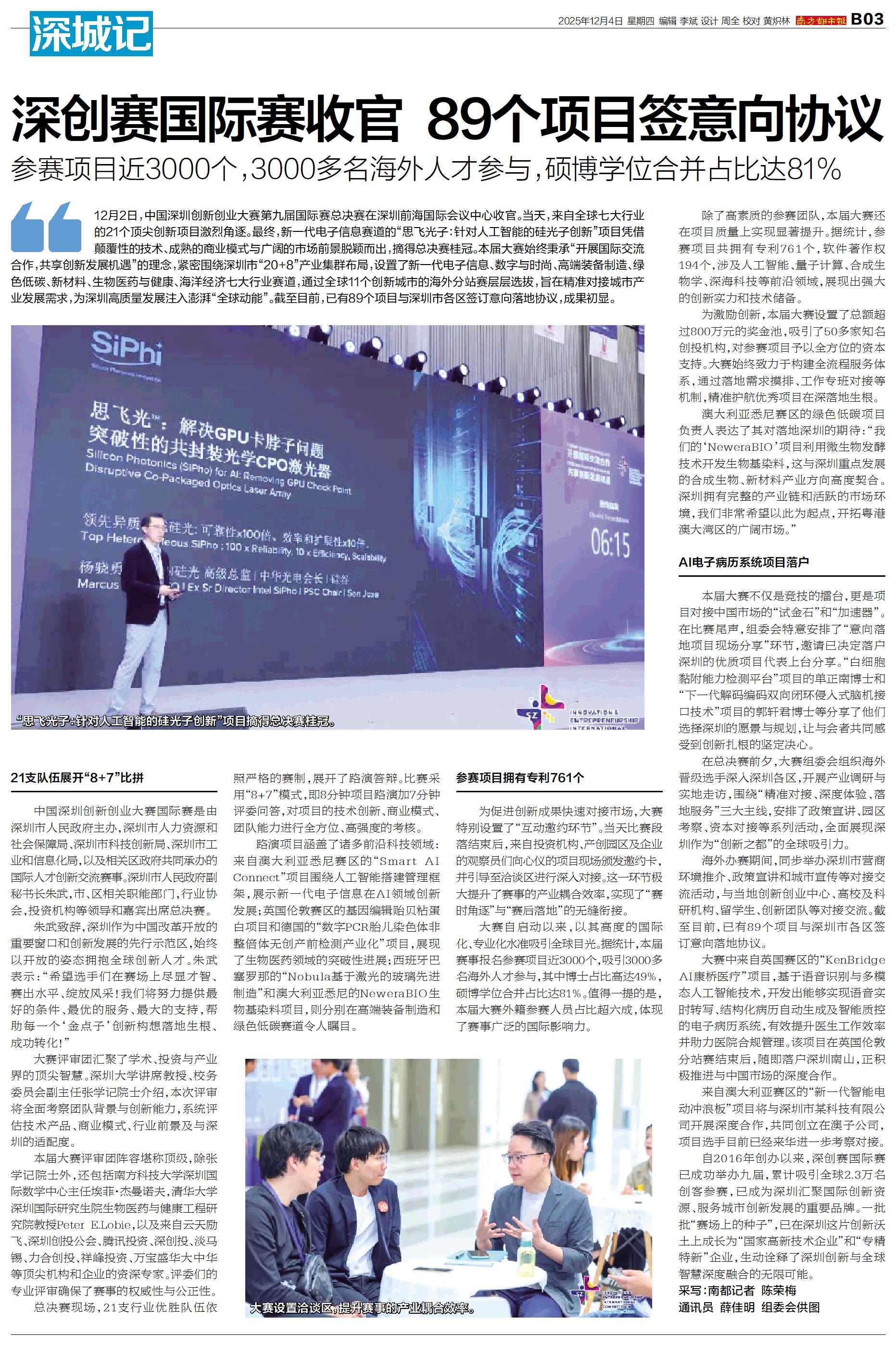 12月2日,中国深圳创新创业大赛第九届国际赛总决赛在深圳前海国际会议中心收官。当天,来自全球七大行业的21个顶尖创新项目激烈角逐。最终,新一代电子信息赛道的“思飞光子:针对人工智能的硅光子创新”项