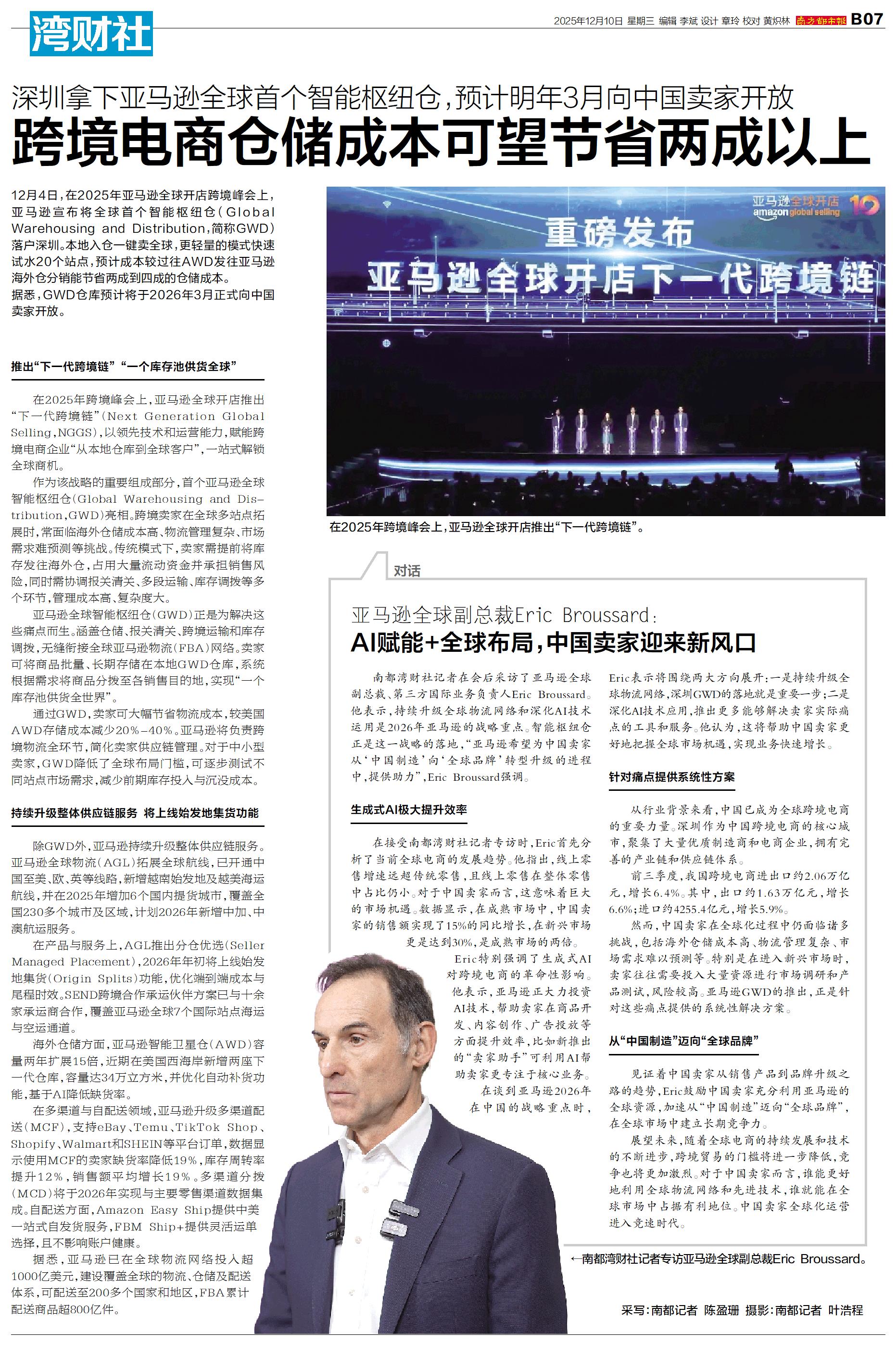 12月4日,在2025年亚马逊全球开店跨境峰会上,亚马逊宣布将全球首个智能枢纽仓(Global Warehousing and Distribution,简称GWD)落户深圳。本地入仓一键卖全球,