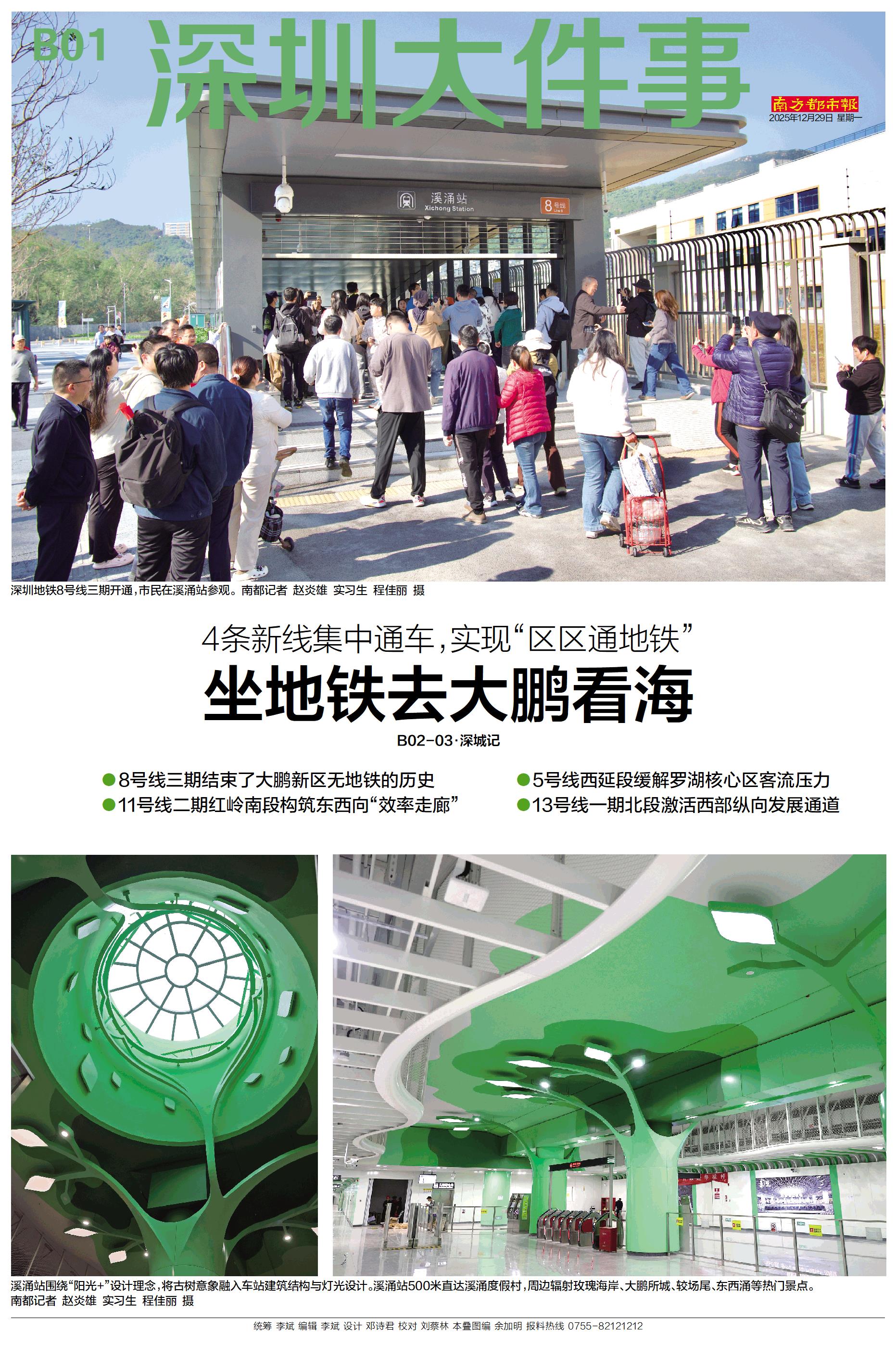 ●8号线三期结束了大鹏新区无地铁的历史 ●5号线西延段缓解罗湖核心区客流压力 ●11号线二期红岭南段构筑东西向“效率走廊” ●13号线一期北段激活西部纵向发展通道 详见:B02