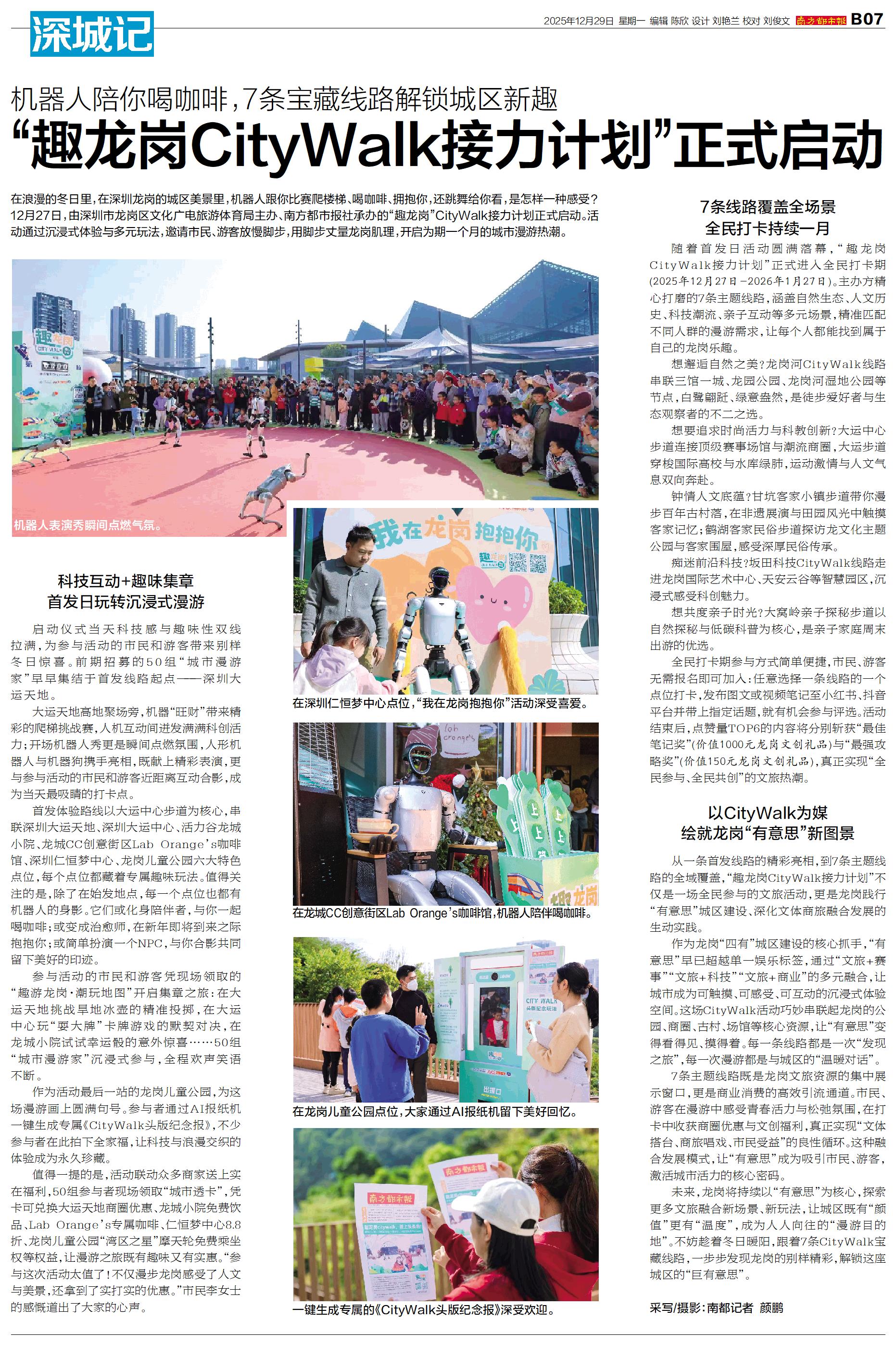 在浪漫的冬日里,在深圳龙岗的城区美景里,机器人跟你比赛爬楼梯、喝咖啡、拥抱你,还跳舞给你看,是怎样一种感受?12月27日,由深圳市龙岗区文化广电旅游体育局主办、南方都市报社承办的“趣龙岗”City